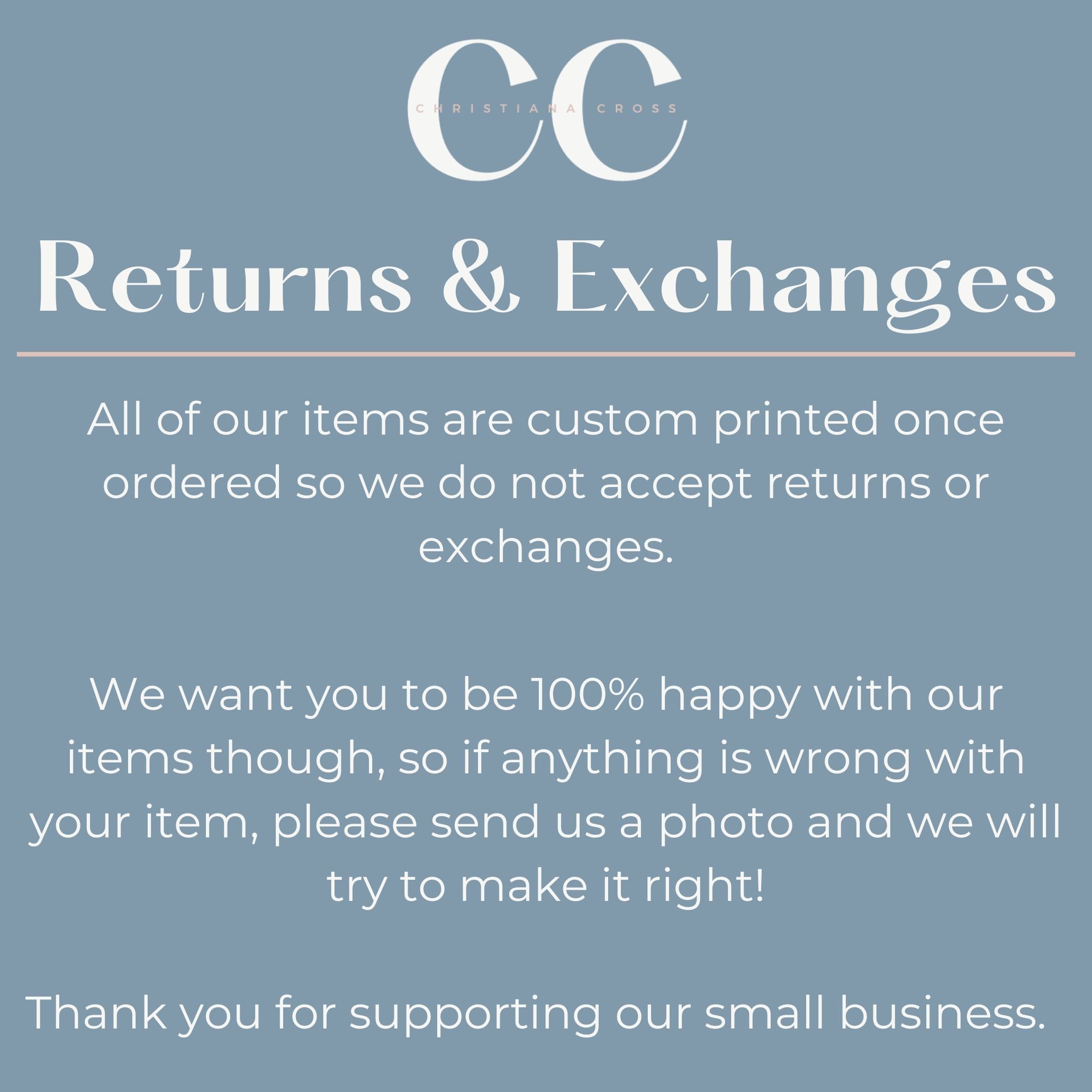 Please Note: All our items are made to order just for you. Because of this we do not accept returns or exchanges but please contact us if you have any issues order and we will do everything we can to help. Thank you. Christiana+Cross