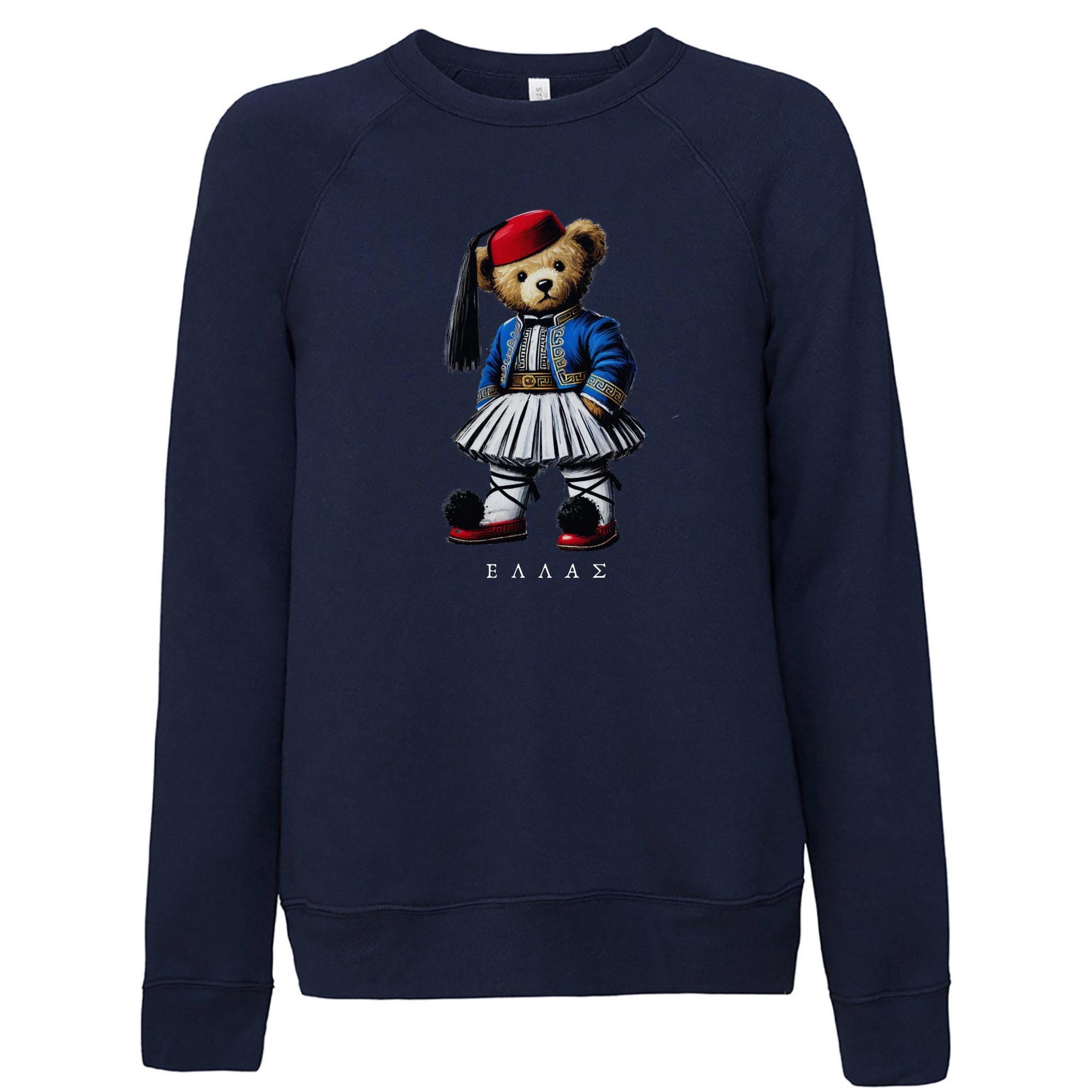 High-Quality Print: Vibrant, durable graphic of Theo the Teddy Bear in a detailed Greek Evzone costume, complete with the iconic foustanella and tsarouhia shoes.